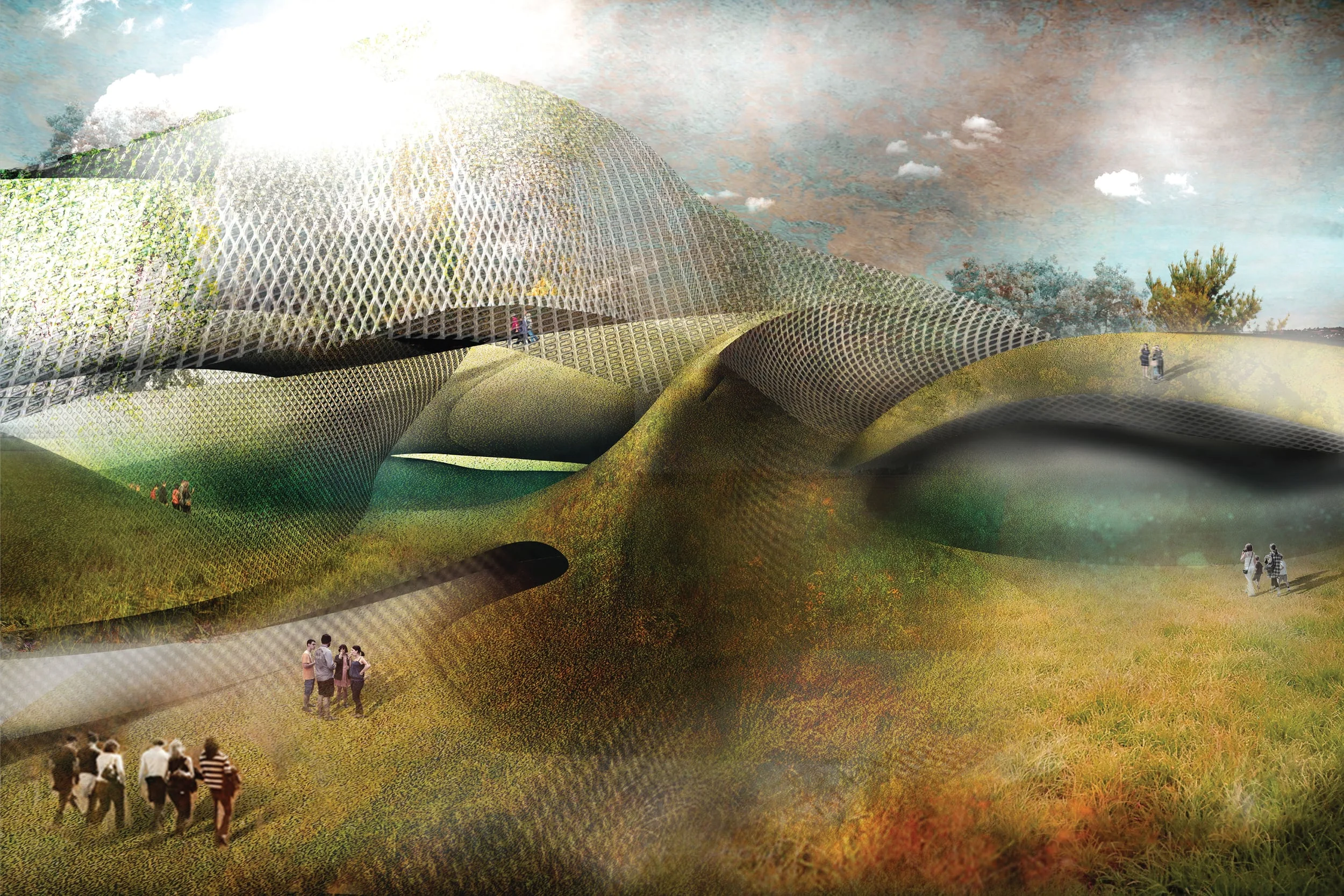 This project site was about 8 city blocks. A parametric and articulated design technique was used to aggregate the program across the large site to achieve the desired spatial and social effect. The circulation script was organized by two systems, existing and imposed human movement, and existing and influenced environmental forces. These were then overlaid together and a parametric script showed the push and pull off of these paths in 2D. This patterning was used to create the form of the project with the four 3D landscape moments imposed on the circulation script to create variation and define spaces.