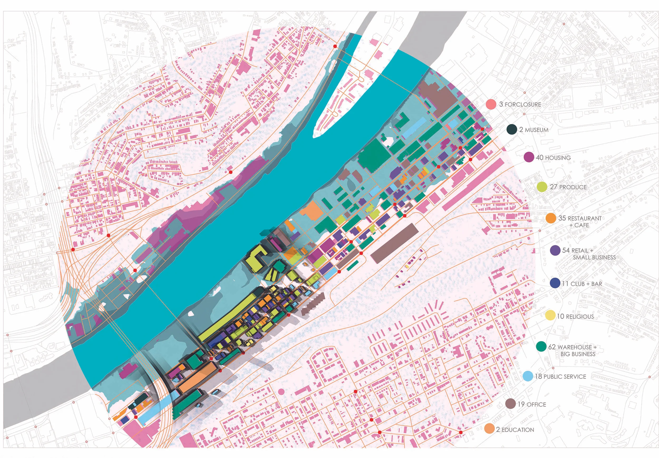 The multi-use program of the project was derived from the context of the strip district. A study of the types of buildings and the character of the place through demographics, architectural tectonics and use drivers is represented through the drawing and diagrams below.