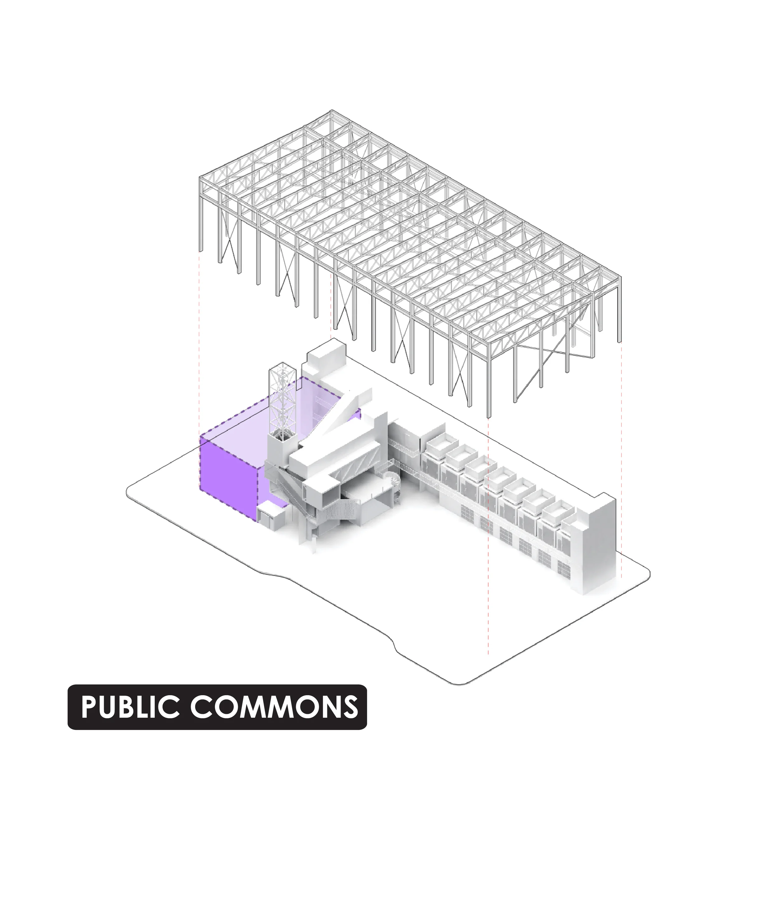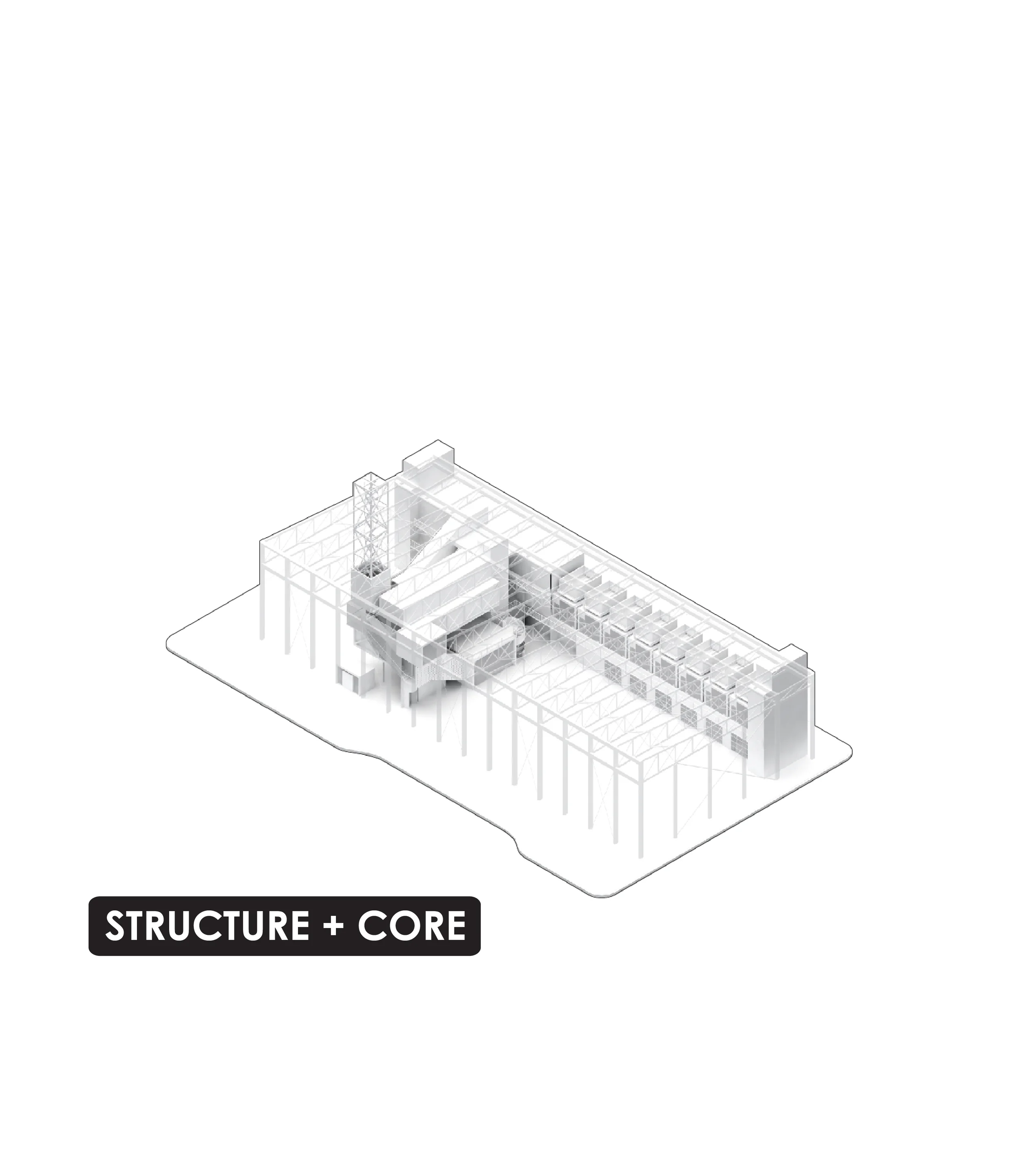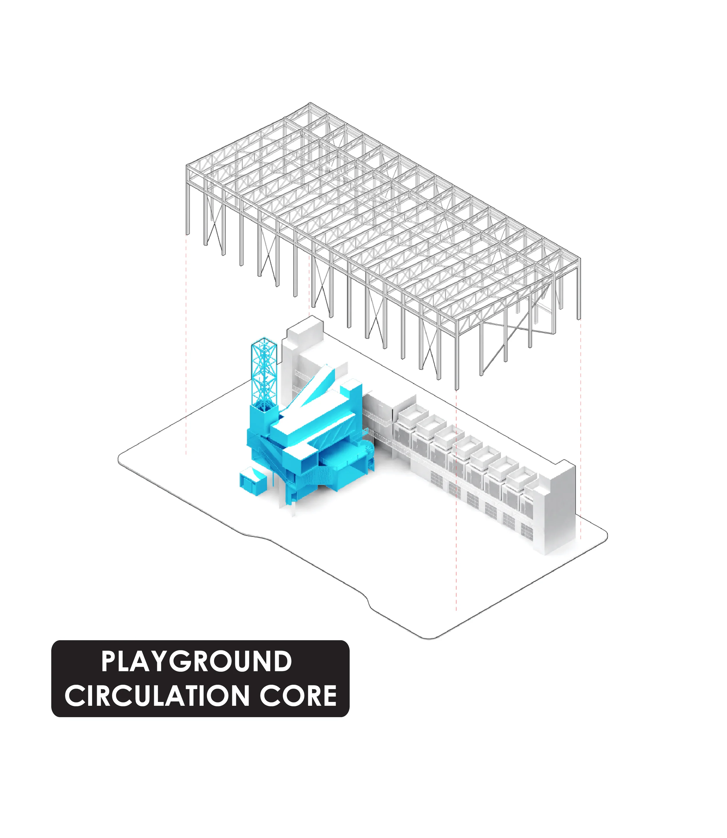 The core between the commons and the open studio separates them acoustically, serves a playful circulation to the roof and service catwalks, houses the smaller program components and offers viewing balconies down onto the open spaces. This becomes a folly within the factory box that acts as the architectural playground.