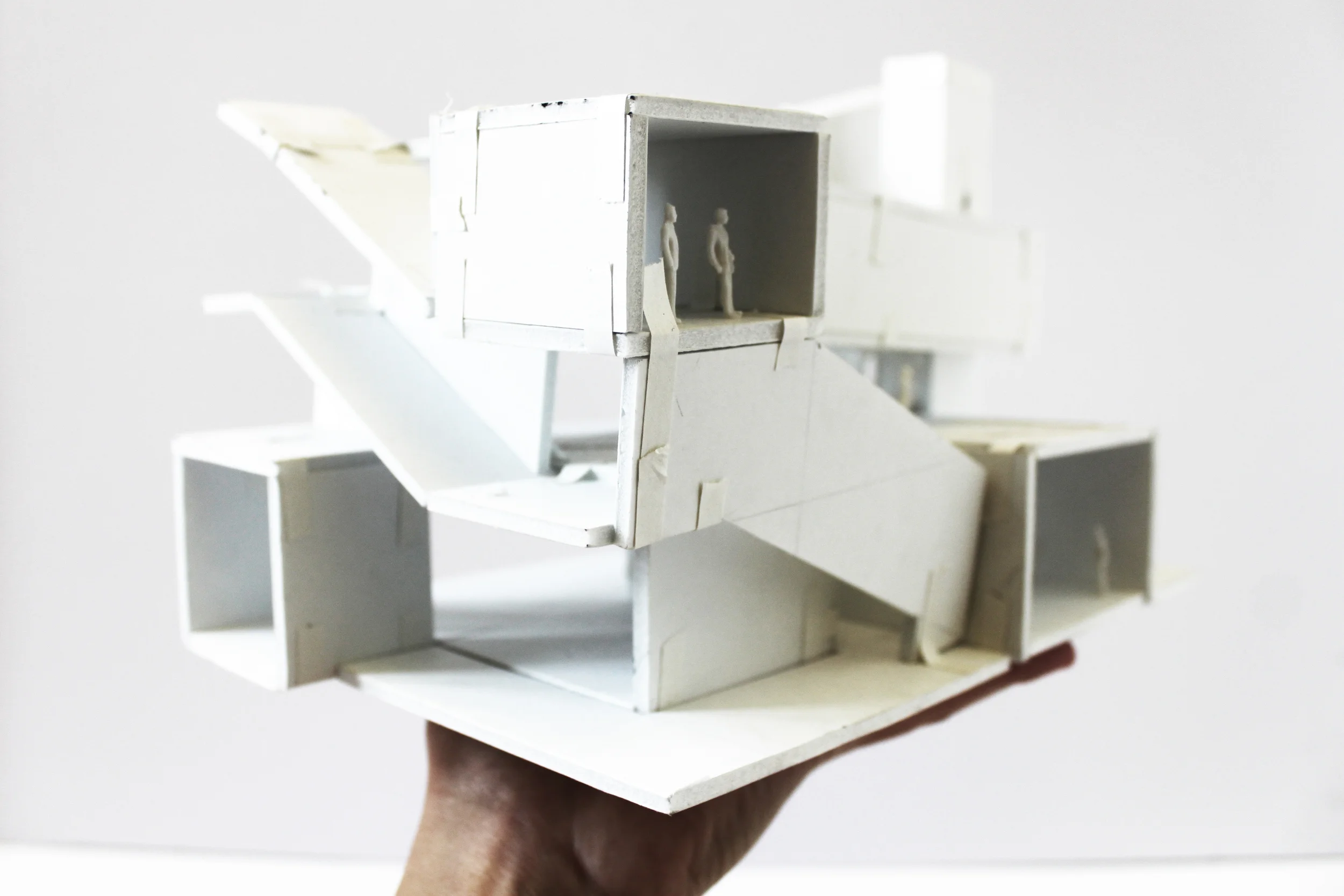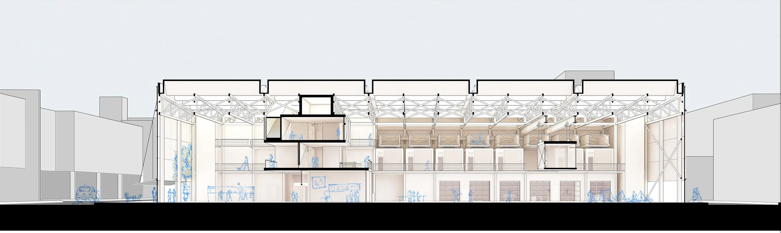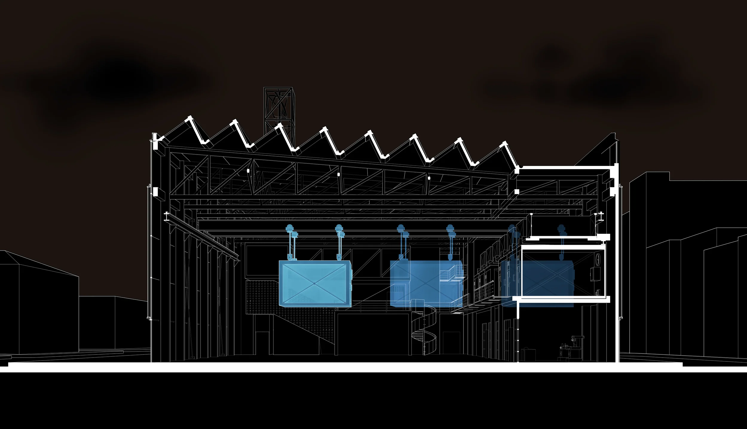The core between the commons and the open studio separates them acoustically, serves a playful circulation to the roof and service catwalks, houses the smaller program components and offers viewing balconies down onto the open spaces. This becomes a folly within the factory box that acts as the architectural playground.