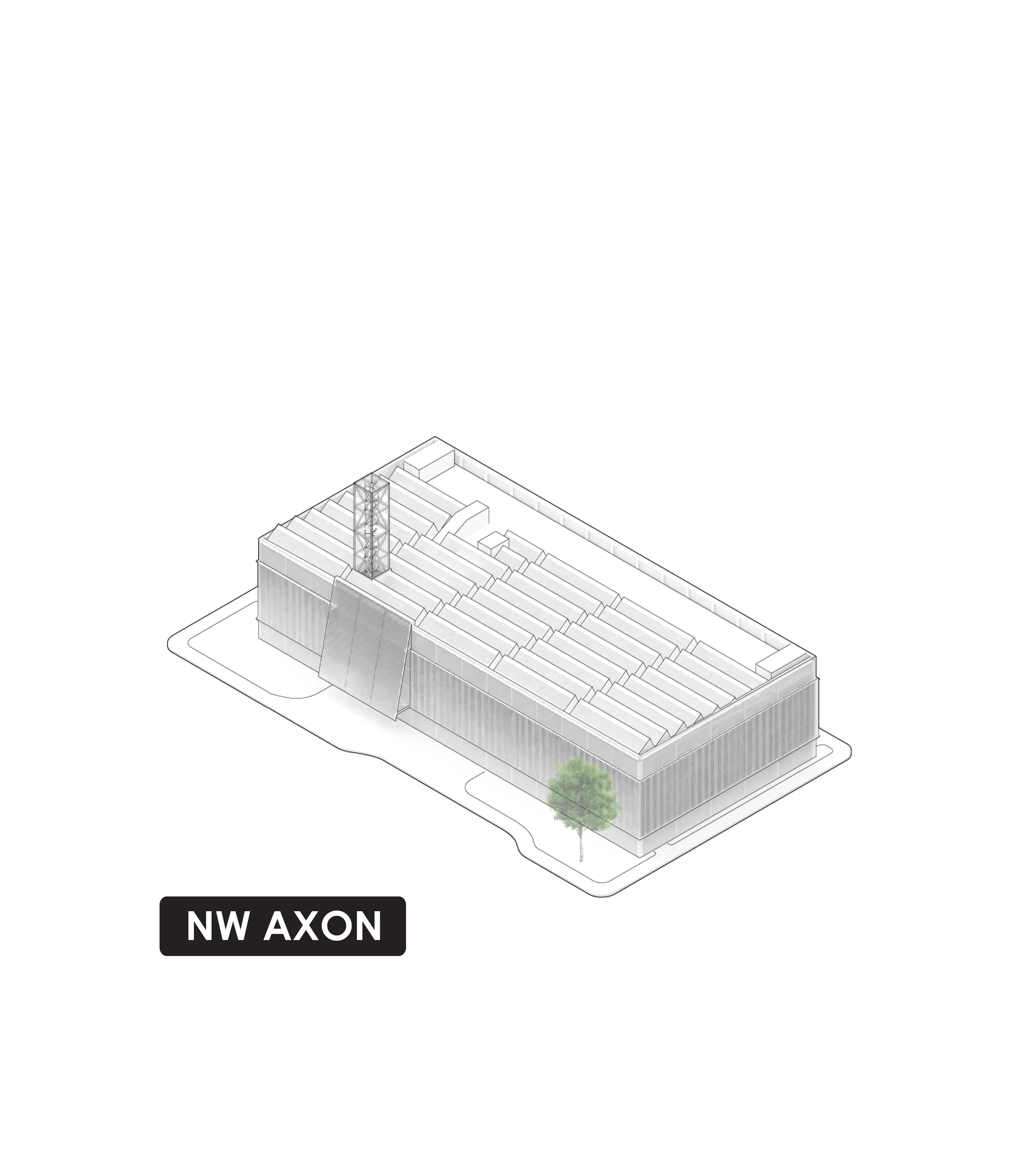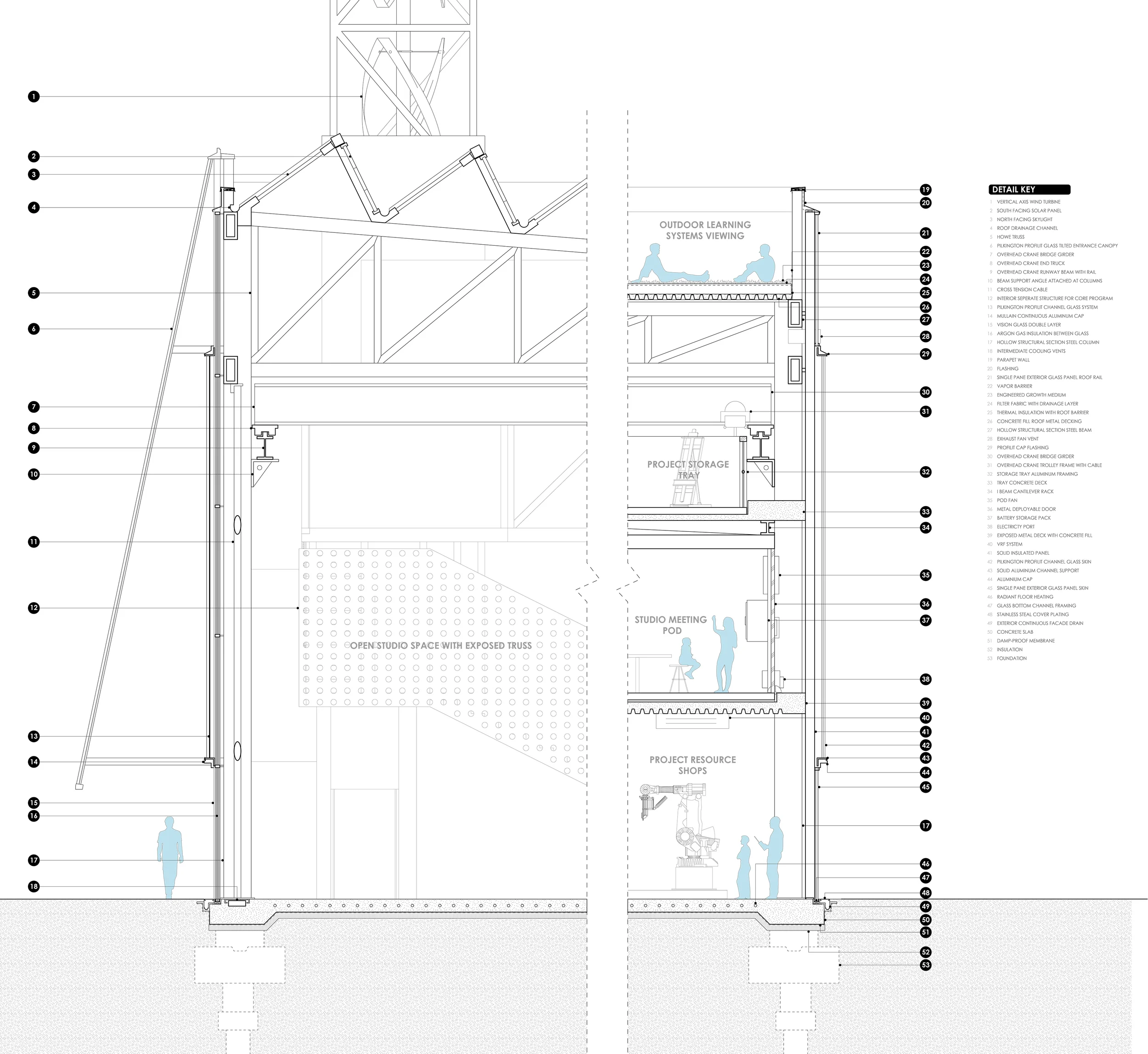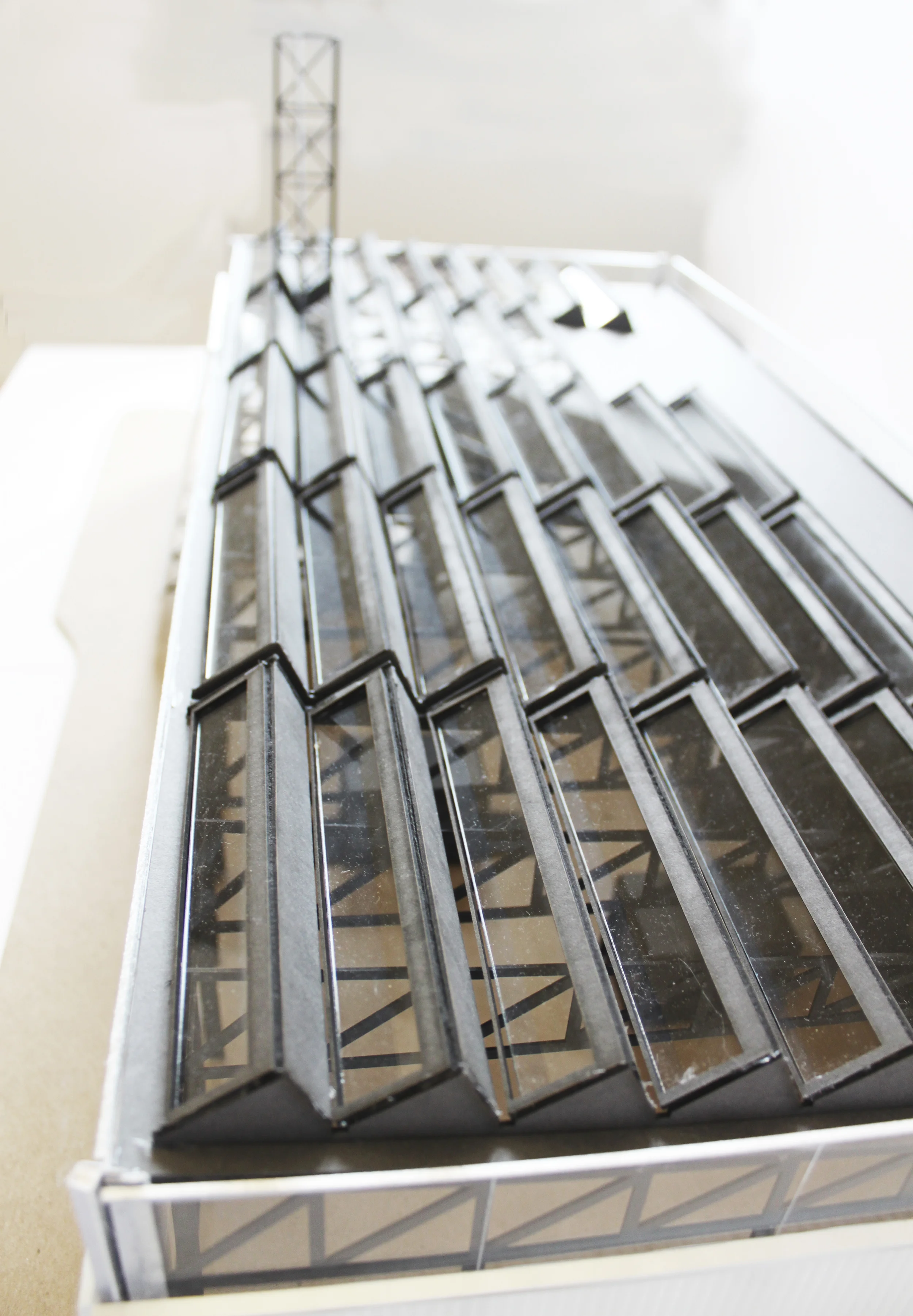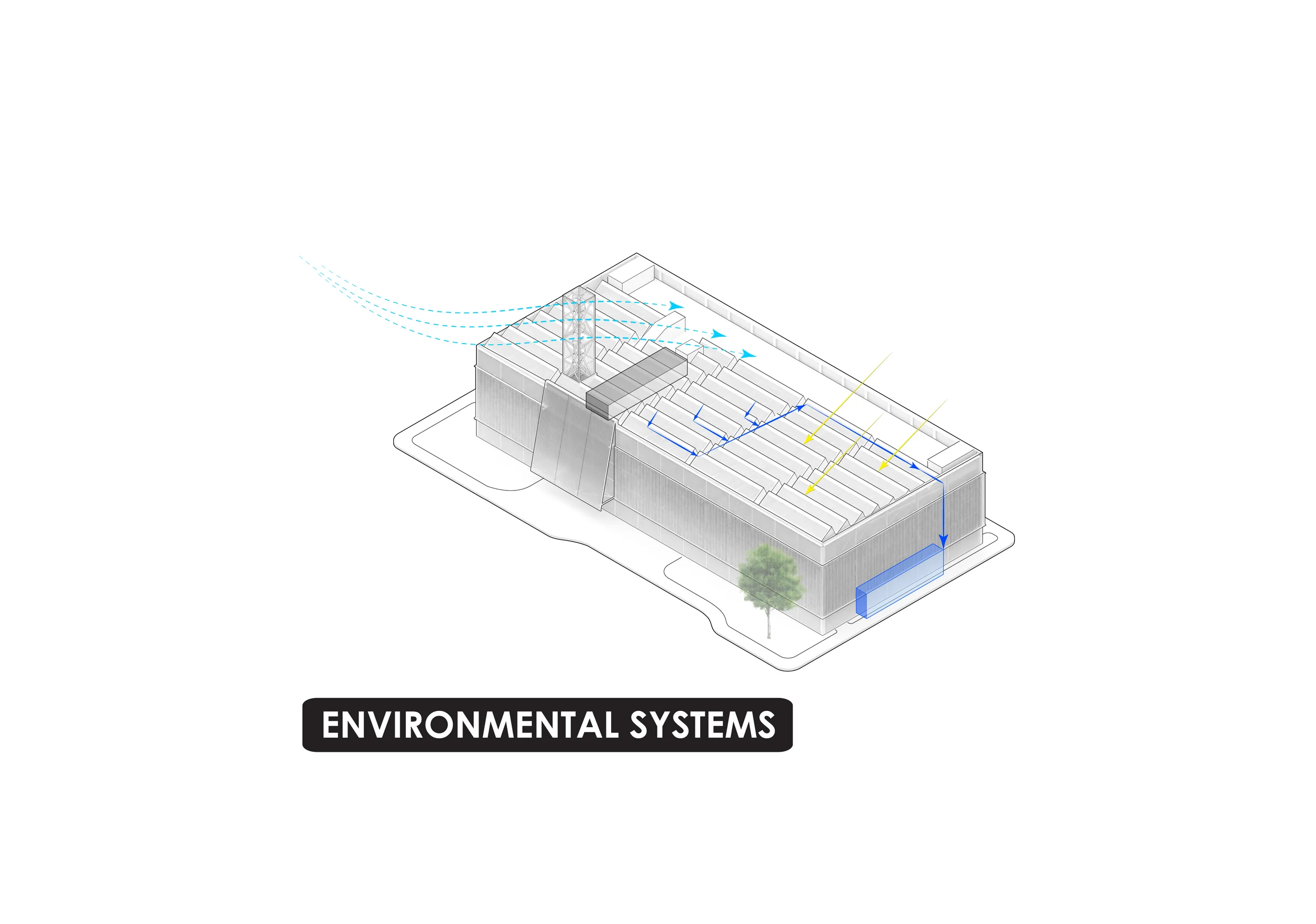 The outdoor learning is elevated to the rooftop to focus the students towards the buildings systems while creating an open yet safe southern stretch of grass. The vertical axis windmill tower is on the windiest corner of the site storing energy to the battery in the core. The sawtooth skylights allow for northern lighting into the space and southern solar panels collecting energy powering the studio pods when docked on the southern service bar. The skylights also allow for rainwater collection through the troughs.