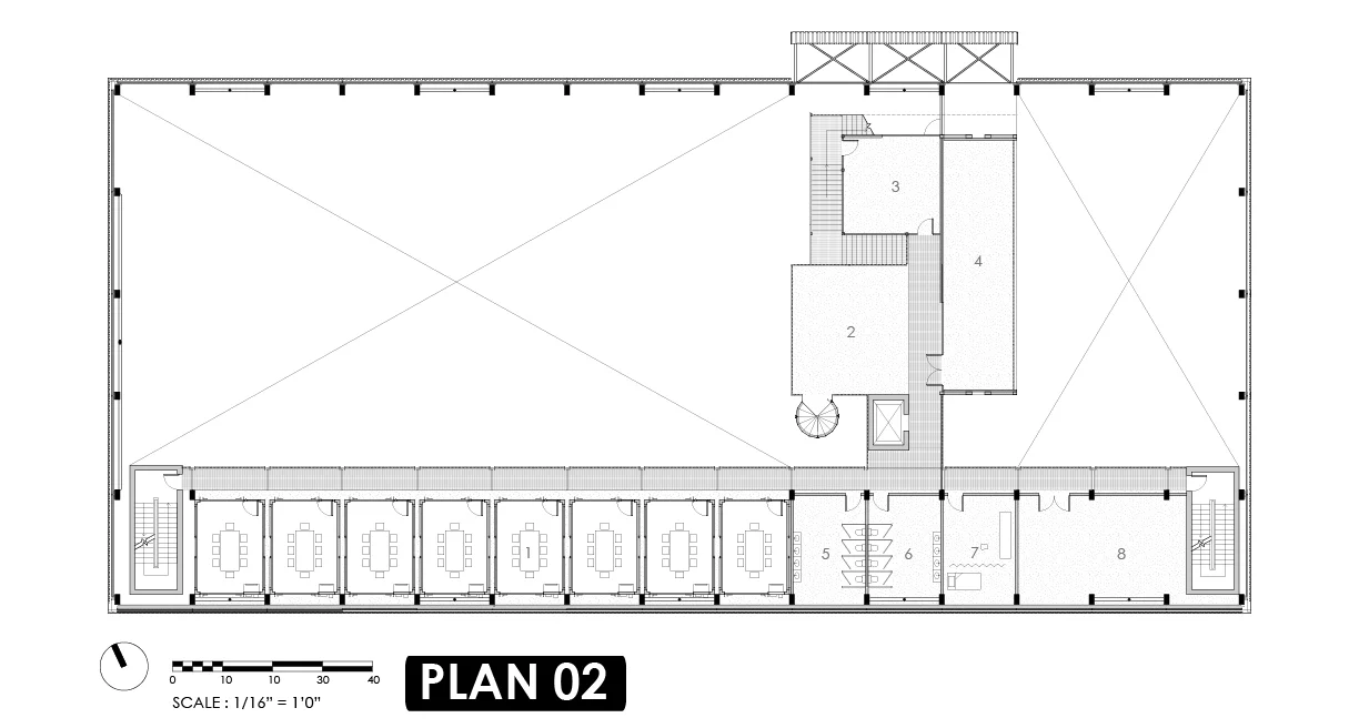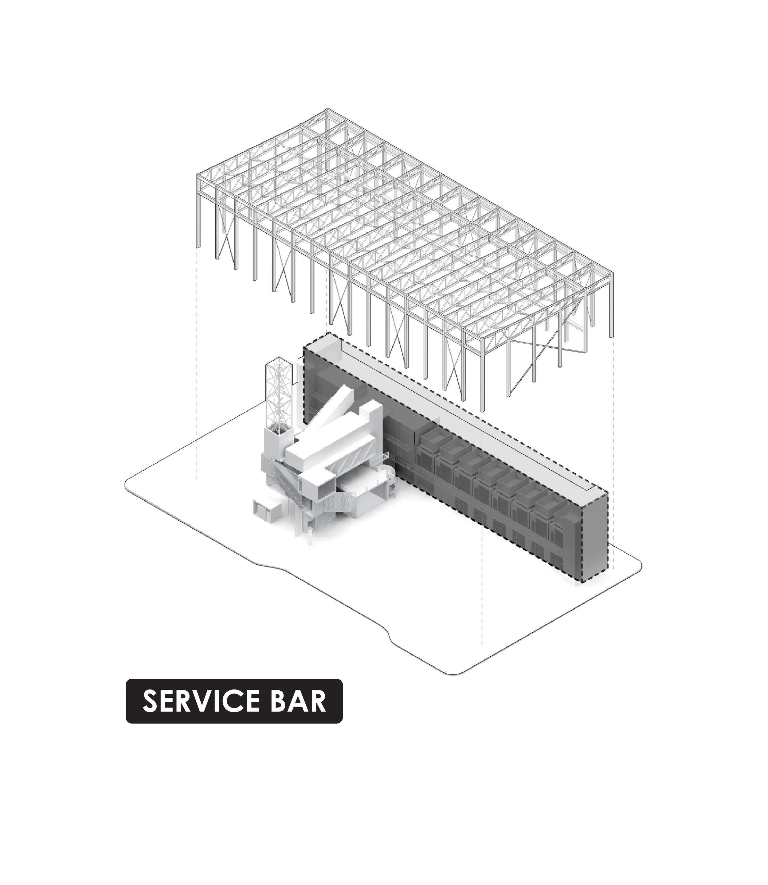 There is a service bar of program along the south wall that spans the length of the building housing support spaces for the main program.