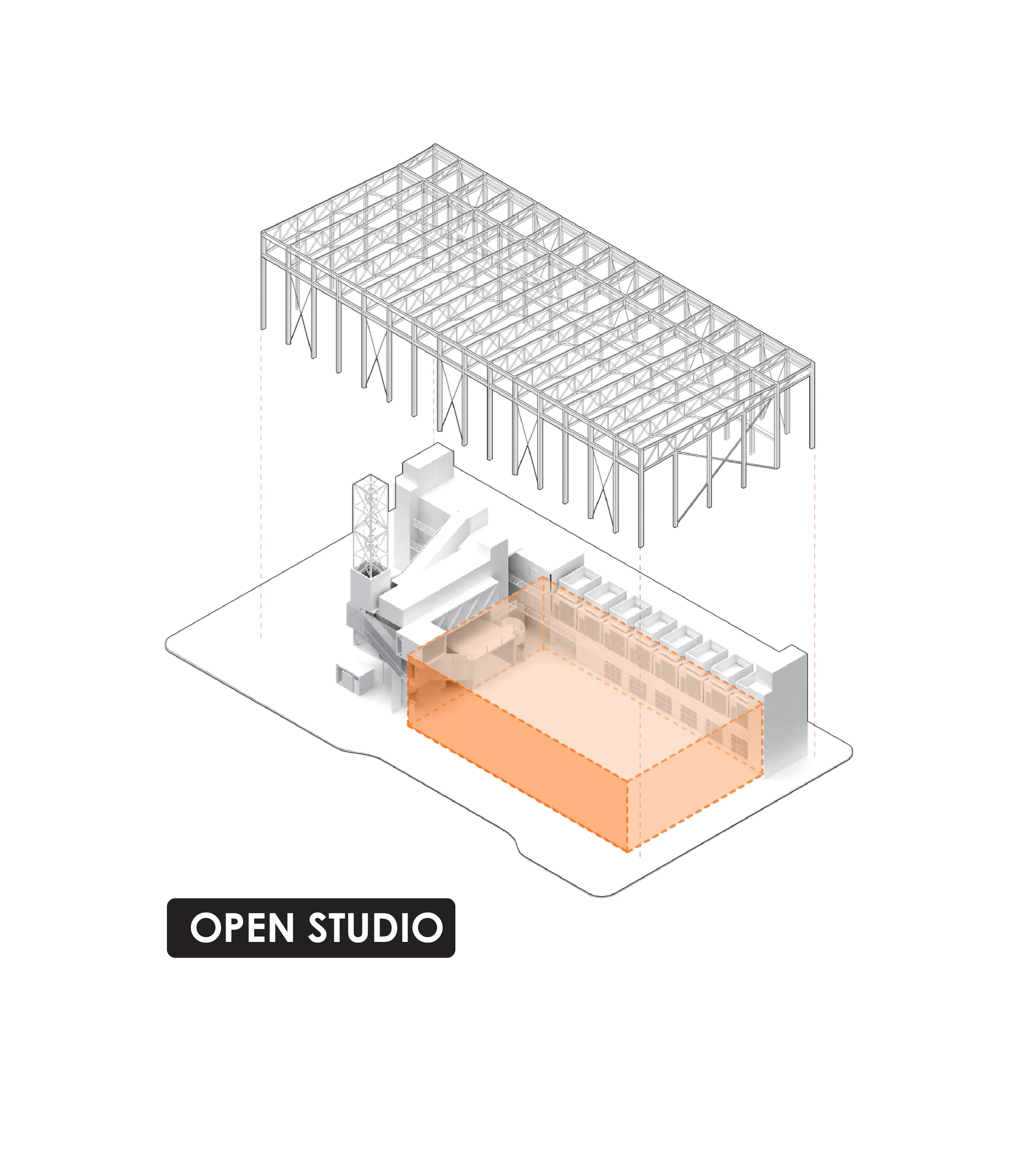The open studio service bar becomes a wall of stationary project shops with garage doors on the ground level, individual systematic studio meeting pods on the second level and project storage trays on cantilever racks above those. These are deployed down into the studio ground level space with an overhead crane system that with a bridge that moves EW and can carry pods out NS.