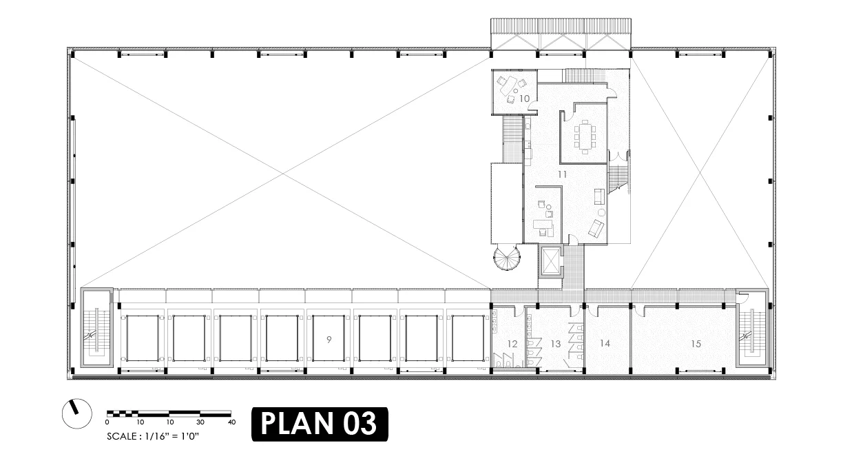The public bleeds into the East end off of main transit path Centre Ave, this commons zone is securely and acoustically separated through the core spaces of reception, balcony and offices from the open free studio.